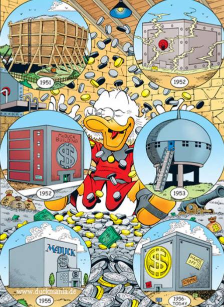 关于史高治的财产,坊间有无数传闻,福布斯杂志估计他老人家身家441亿美元,也有人猜他有几万亿美元。但确切是多少,连史高治自己都不清楚。