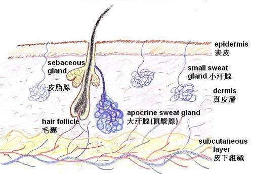 大汗腺占了剩下的 10% ,它们集中分布在腋下、足部、会阴、乳晕、腹股沟、外耳道,成分粘稠浓郁,夹带了各种蛋白质和脂肪酸。它们本来是不臭的,但分泌物被体表的细菌分解以后,生成了各种不饱和脂肪酸,才有了臭味。所以狐臭的根本原因,是细菌和大汗腺分泌物的共同作用。