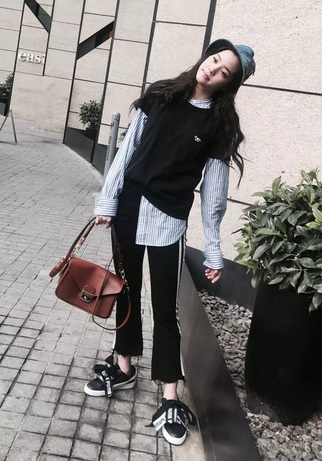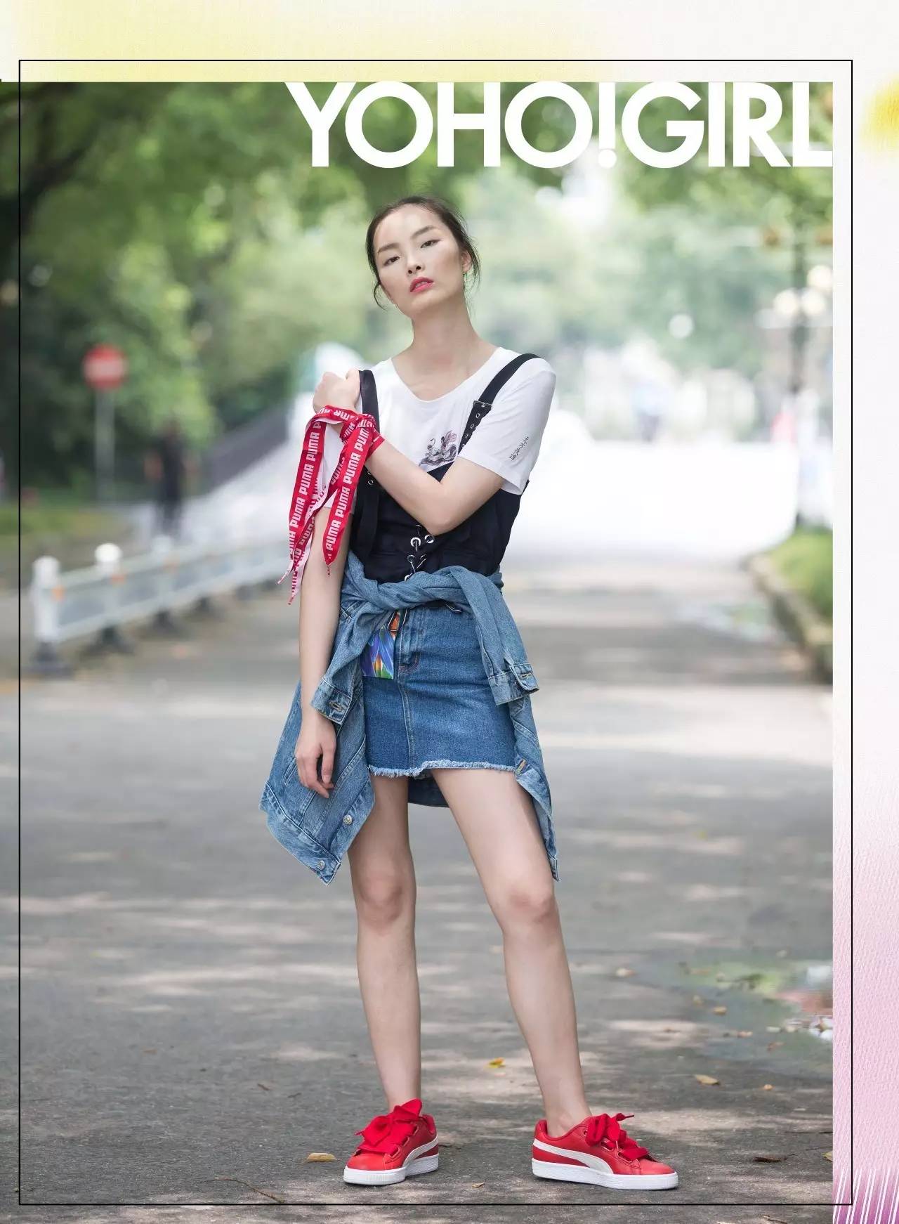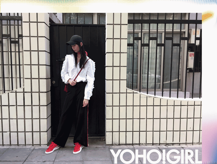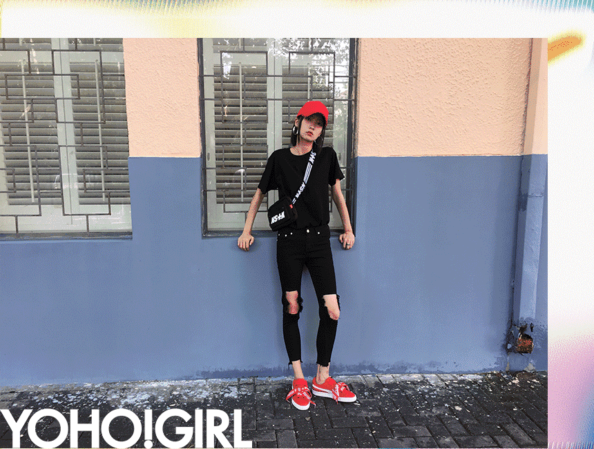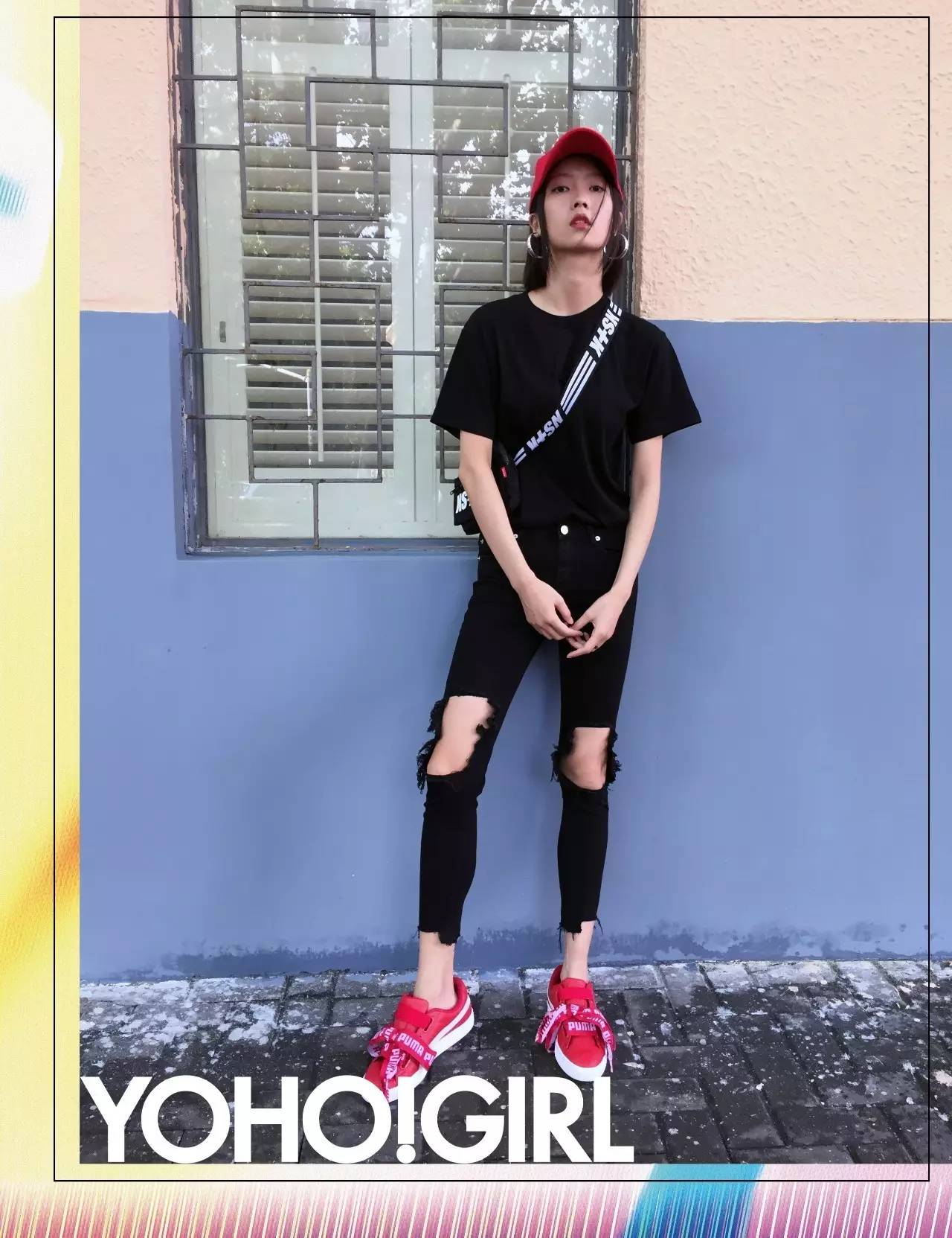 Y:因为这双鞋子本身是红色,款式也很抢眼,所以就想要搭配的简单一点,用黑T黑牛仔破洞裤来突出鞋子!但选了红色棒球帽作呼应。小挎包的运动风,包带也刚好和鞋带呼应,就是我的小心机啦,整身还是以轻松舒服为主。