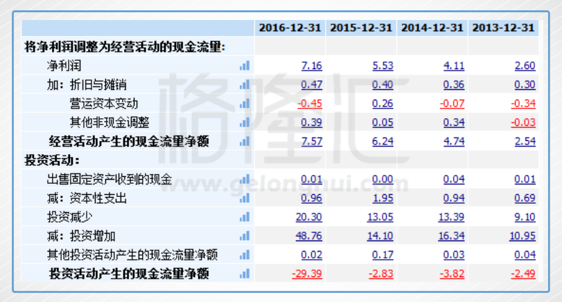 投资现金流一眼看上去挺吓人的,2016年流出29个亿。但实际远不是如此,公司通过IPO募集资金27.92亿,现金大增。周黑鸭用它买了22.6亿的三个月以上的定期存款,4.8亿的可供出售投资,还有一些结构性存款。真正与公司未来经营有关的资本支出就1个亿左右。