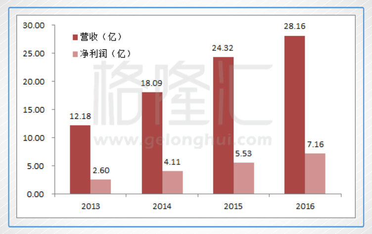 从13年到16年,周黑鸭的门店总数从389间增加到778间,大约一倍,营收从12.18亿增加到了28.16亿,增加了一倍多,而净利润从2.6亿增加到了7.16亿,增加了2倍多。