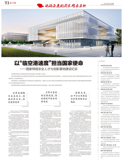 2016年9月19日,第三届国家网络安全宣传周在武汉开幕。当年9月30日,中央网信办复函武汉,支持开展国家网络安全人才与创新基地建设,打造国内首个独具特色的“网络安全学院+创新产业谷”基地。