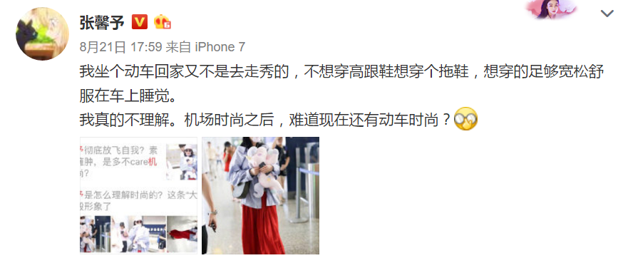 前几天,张馨予发了条微博解释自己被拍到穿衣臃肿的事情,还顺便diss了一把那些把机场当做秀场的明星们:“我坐个动车回家又不是去走秀,想穿的足够宽松舒服在车上睡觉,难道机场时尚之后,难道现在还有动车时尚了?”