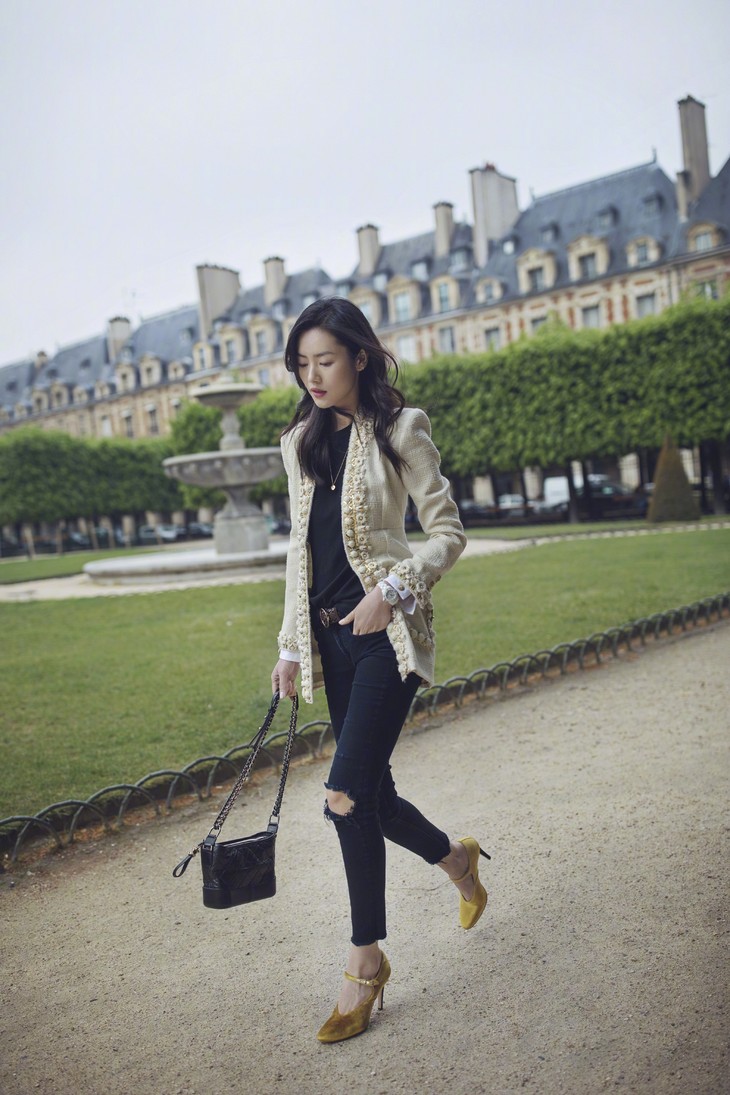 刘雯脚踩Chanel金黄色丝绒高跟鞋