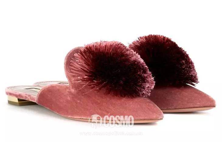 还有一双丝绒一字带凉鞋,COCO也是不得不臣服于它的美色之下啊!这双一字带来自Stuart Weitzman,上半部分的毛毛设计是不是有点萌得犯规了?