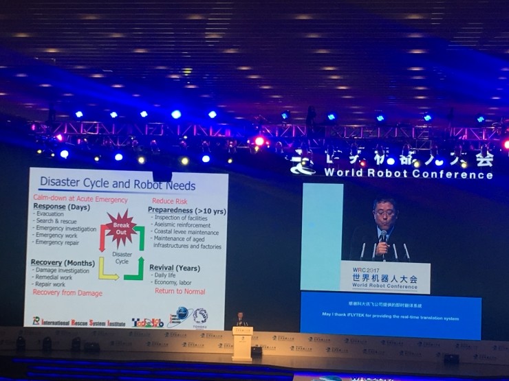 来自日本的IEEE RAS现任主席Satoshi Tadokoro是参加大会的其中一位知名科学家,他在今天的主论坛上发表了关于“日本灾后救援机器人”的演讲。