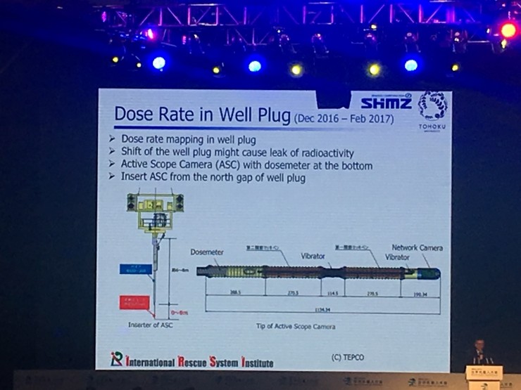 这里辐射也是一个很大的问题,所以我们也想通过摄像头的拍摄,研究了解到它在不同深度的辐射强度到底有多少。这张图显示了不同深度的辐射强度有多少,辐射水平是一个非常危险的水平,这对我们下一阶段的研究是非常重要的。