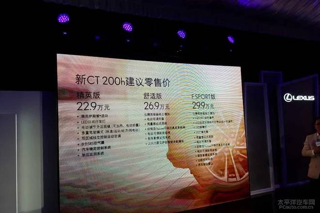 新款雷克萨斯CT200h也在成都车展前夜正式上市,新车继续搭载有1.8L汽油发动机+电动机组成的混动系统,共计推出三款车型,售价区间为22.9 - 29.9万元。