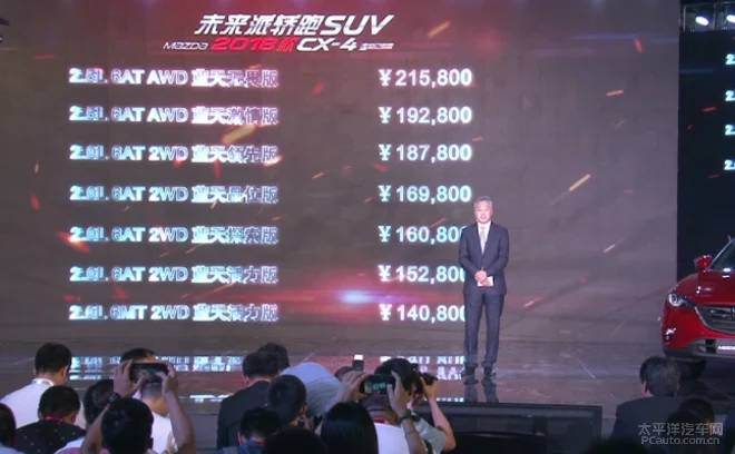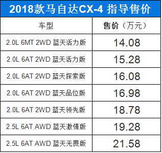 在成都车展前夕,2018款一汽马自达CX-4正式上市,新车首次搭载上名为GVC加速度矢量控制的超级驾控系统。新款车型提供2.0L/2.5L动力可选,共计推出X款车型,售价区间为14.08 - 21.58万元。