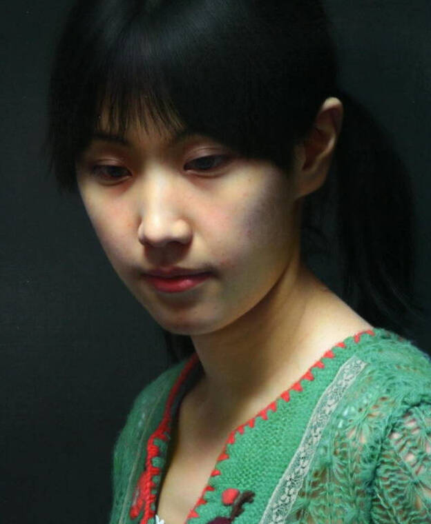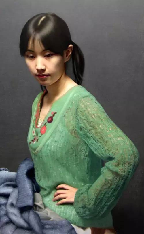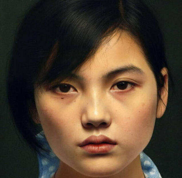 《肖像之相——小唐》的人物,是清纯甜美无邪的,像西方教堂里的童女那样纯洁,她的形象和当下物欲横流的社会似乎有着鲜明的对比。少女那纯朴甜美迷人的形象,就像生活中的邻家少女一样。她的肌肤发着光泽,却又湿润。眼睛是那样的水灵晶莹,以极细致的线条勾勒出来的秀发黢黑而浓密,衬托出纯真、甜美、细腻的粉红色脸庞。嘴唇上自然的红色与脸部肤色十分地和谐,就跟真的皮肤一样,已经完全看不出绘画手段的痕迹,似乎是高精度的放大照片,但又是实实在在用手工用颜料绘制出来的,真正达到了“细腻而不腻,逼真而非真”的大师水准。