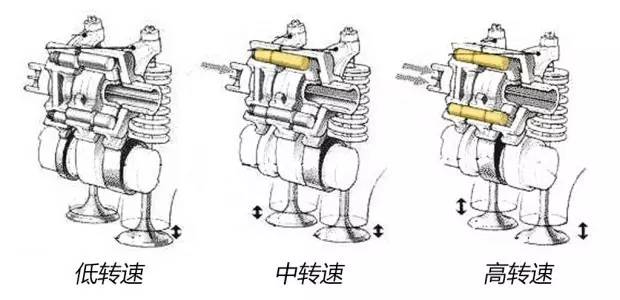 两组凸轮对应的是发动机的不同状态,在中、低转速用低角度凸轮,此时一个气门升程很小,几乎不起到进气作用,进气通道基本上相当于单进气门发动机。而在高转速时,高角度大凸轮用来提高进气量,进气流通面积和开启持续时间大大增加,给发动输送更多的混合气体,从而实现高转速时的高动力性能。
