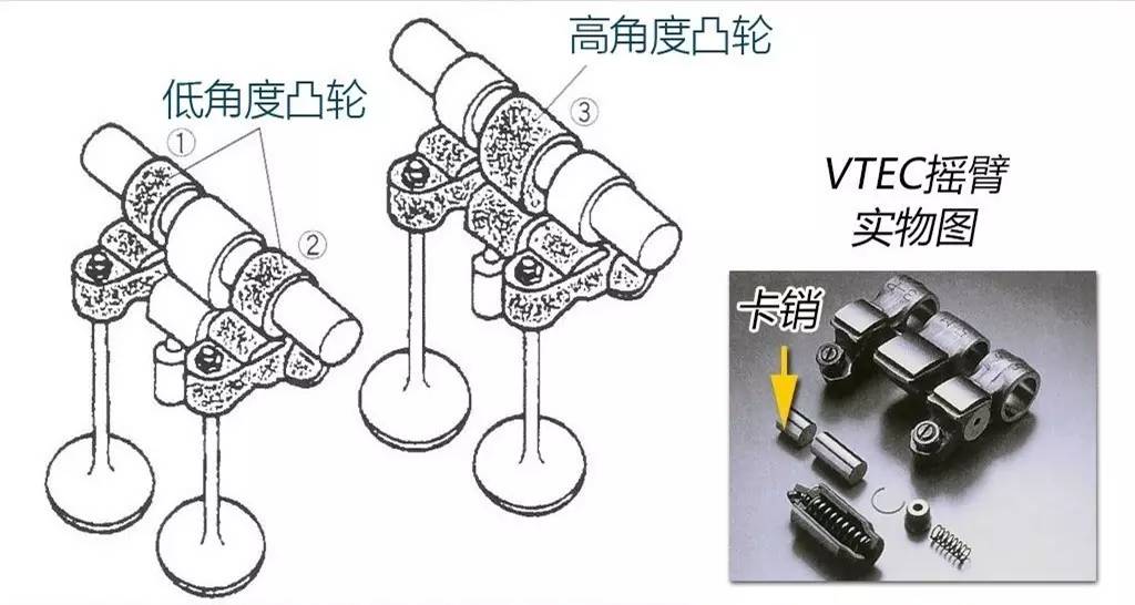 那么问题就来了,VTEC技术是如何做到让发动机"高潮"的呢?这里就不得不佩服本田的"技术宅"本色,在不大范围改变发动机结构的前提下,本田在凸轮和摇臂的数目、运作上做文章。它使用两组不同大小的凸轮,配合气门摇臂上的同步卡销(三段式VTEC),就可以实现对于气门升程和正时的调节,是一个成本和功效两全其美的方法。