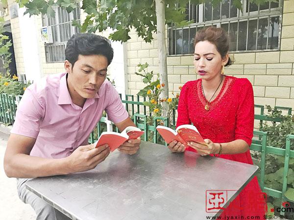 8月20日,海热古丽·艾买尔和朋友在一起阅读《新疆维吾尔自治区惠民政策明白册》。黄净摄