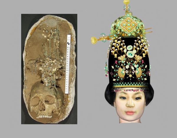 与颅骨同出的还有头冠残件,头冠的材质包括了金银、绿松石、红宝石、琥珀、珍珠、玛瑙、象牙等材料,冠饰由非常多的小部件组成。出于保护的目的,考古人员将颅骨连同冠饰整体提取回实验室,进行修复工作。经过中德专家历时一年半的修复,成功提取了多达370个小部件,并根据古代文献及唐代壁画,采用虚拟工程技术复原了这件公主冠。根据复原图,我们可以看到这件公主冠的精美。