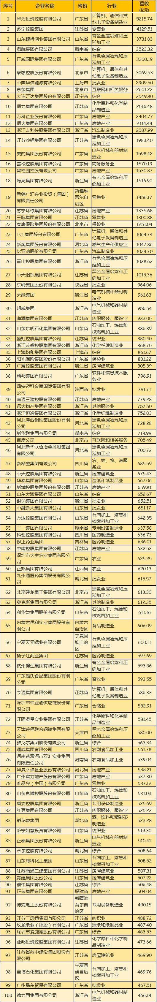 广东:华为投资控股有限公司(5215.74亿元),它在民企500强榜单中排名第一;