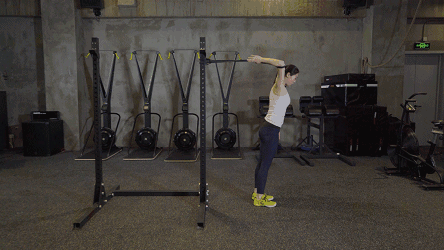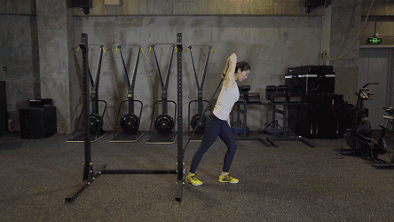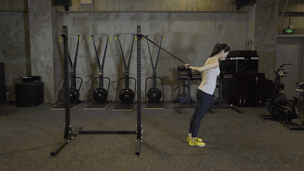▲弹力带固定在身后锚点,单手抓住弹力带转身背对弹力带,身体向前倾斜。做到极限后深呼吸,吸气时保持位置不动,呼气时加深拉伸幅度。