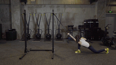 ▲将弹力带固定在靠近地面的锚点,单手抓住弹力带,转身弓步,将手肘抬高,拉长肱三头肌,做到极限后深呼吸,吸气时保持位置不动,呼气时加深拉伸幅度。