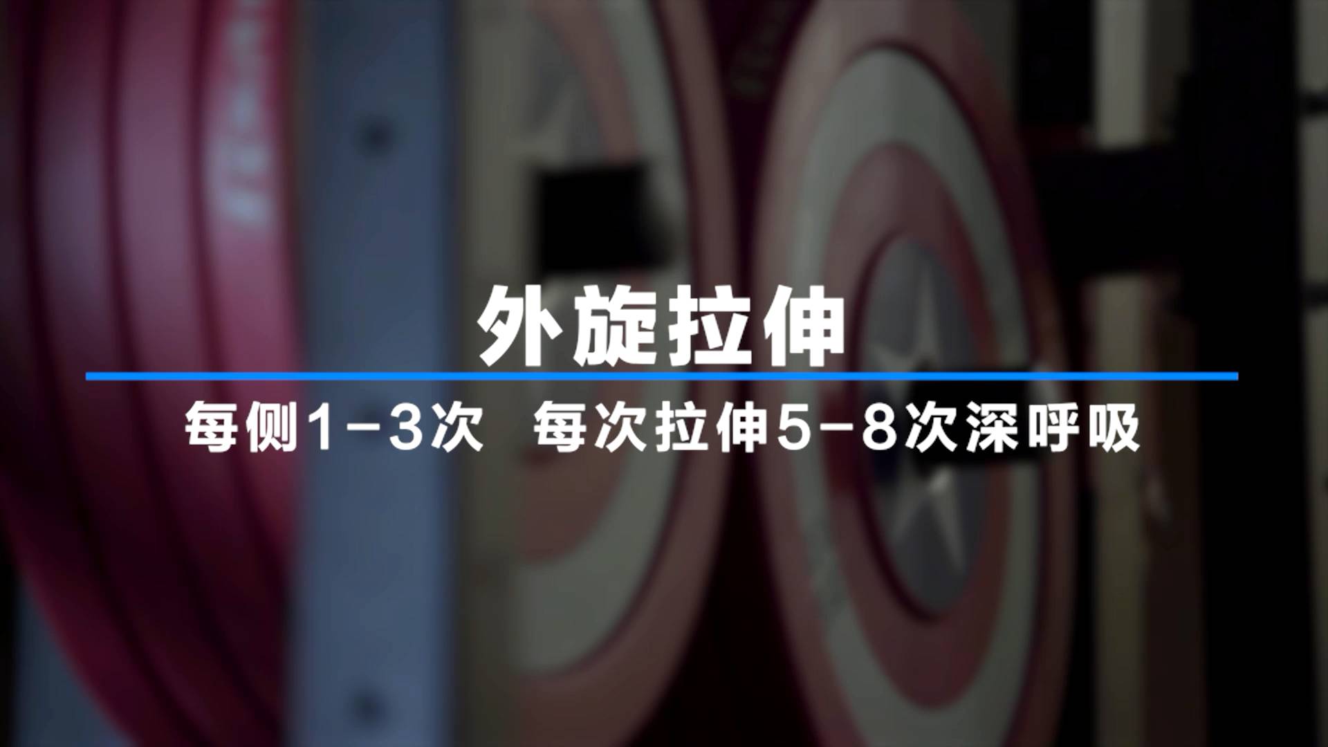 这个动作可以提高外旋的活动度,拉伸放松负责内旋的肌群(大圆肌、肩胛下肌、胸肌、背阔肌)。 躯干时大臂要固定。