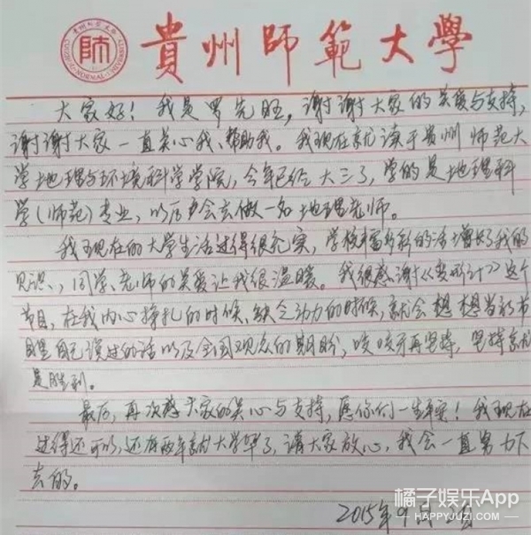 上大三的时候,他还给关心自己的人写了一封信,说自己学的是地理与环境科学学院,大学生活很充实。