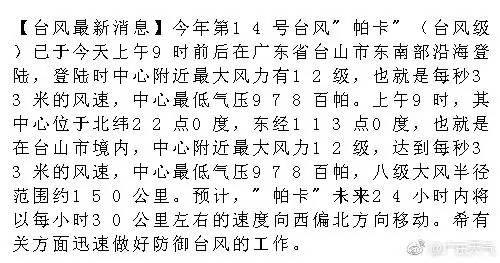 原标题:注意!“帕卡”已在台山登陆!珠海、中山、江门全市停工停市停课!注意!注意!注意!据@广州天气,今年第14号台风“帕卡”已于27日9时前后在广东台