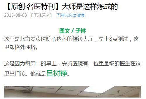 2015年8月8日晚上,她发出她的微信公众号第一篇文章《大师是这样炼成的》,回忆她曾经采访过的北京安贞医院心内科吕树铮教授的故事:“这里是北京安贞医院心内科的候诊大厅,早上8点刚过,这里却格外拥挤。这是因为每周一的早上,安贞医院有一位重量级的医生在这里出门诊。他就是吕树铮。”