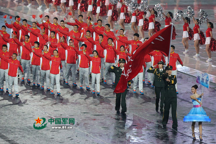 中国军网天津8月27日电 记者张晓君、康哲报道:8月27日晚上八点,第十三届全运会开幕式在天津奥林匹克中心体育馆举行。开幕式上,紧随裁判员代表方队走来的是中国人民解放军体育代表团,他们一亮相,便吸引了众多观众的目光。扛着解放军代表团大旗的仲为君,穿着军装进场时,更是惊艳了现场观众。