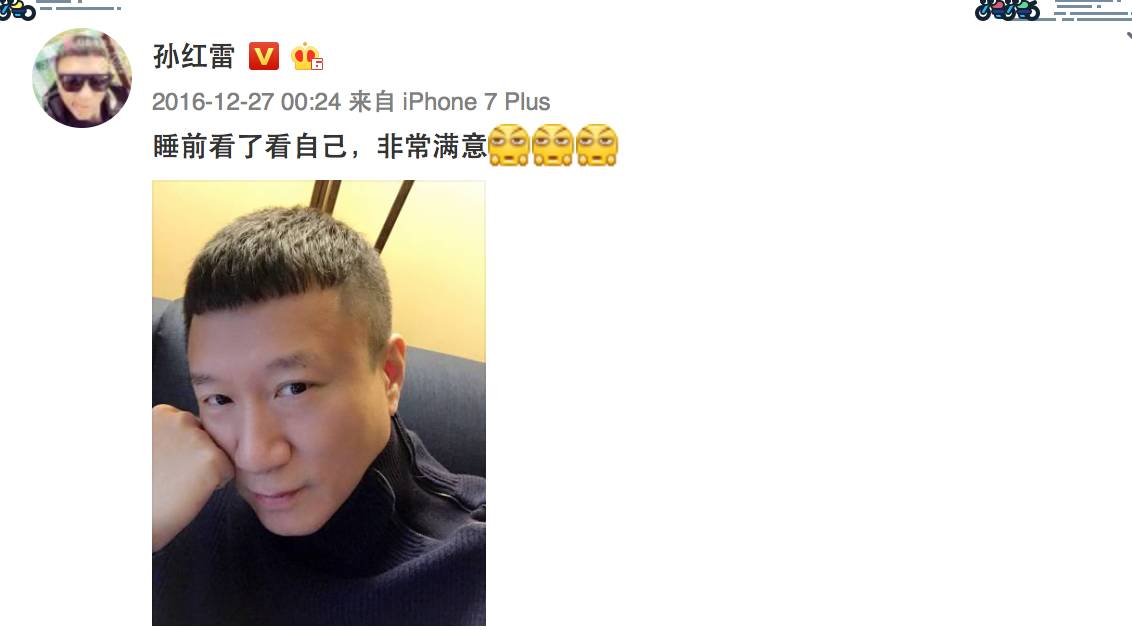 所以,孙红雷才有了“暖男孙漂亮”这个名字。而这不过是他众多外号中的一个而已,他还被叫做“颜王”、“帅雷雷”等等,最喜欢在微博上晒照夸自己“又帅又漂亮”。