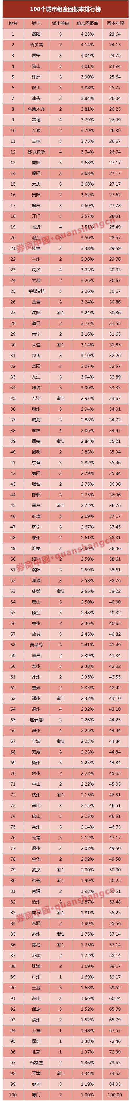 在榜单的100个城市中,仅衡阳、哈尔滨、西宁、鞍山,4个城市的租金回报率高于4%,21个城市租金回报率低于2%。