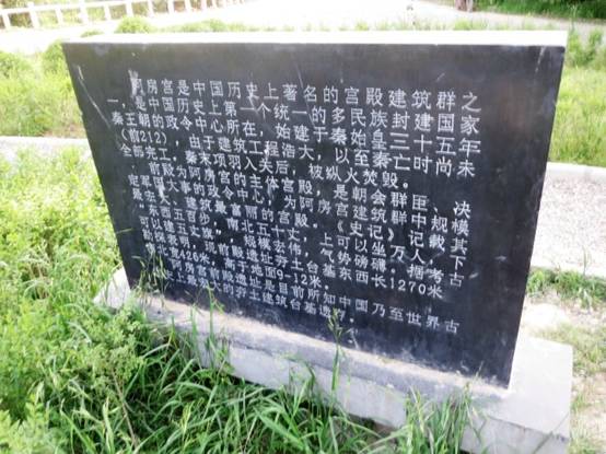 阿房宫最大的建筑,阿房宫前殿的遗址,长1270米,宽426米,高7—9米,占地面积接近60万平米,是故宫的三分之二。注意下面的石碑文字上说阿房宫是被项羽烧毁,这是因为石碑被西安市文物局立于1995年,实际上21世纪的考古发现,不能确认阿房宫是项羽所烧。
