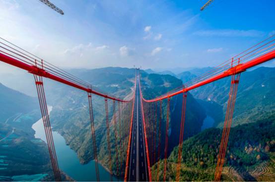 再比如世界最高的桥梁,世界前六名都在中国,下图是中国第六,也是世界第六高的贵州清水河大桥,桥面到谷底406米,世界第一是贵州北盘江大桥,高度565米。