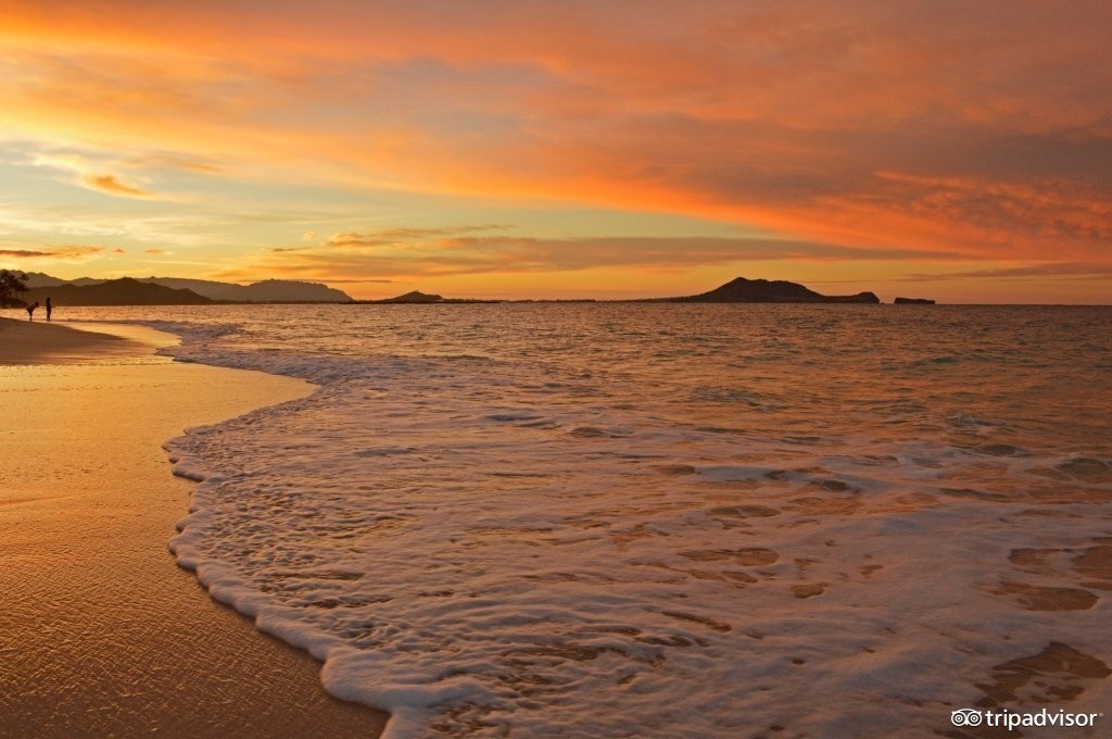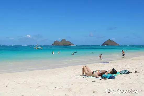 位于凯卢阿镇(Kailua)的拉尼凯海滩(Lanikai Beach)被誉为全球最佳海滩之一,闪烁的沙粒、白色的沙滩、繁茂的热带树木和一年四季璀璨的阳光使得这里成为夏威夷一道旖旎的风景。因为受到珊瑚礁保护的缘故这里的海浪相对平稳,深绿色的静谧海水最适合做明信片上的风景。