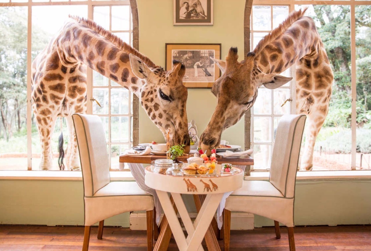 想在餐厅吃饱,最好加快用餐速度,因为随时会有贪吃的长颈鹿伸进脑袋吓你一跳和你抢食,面对这么一个萌物,谁忍心把盘子挪开呢?