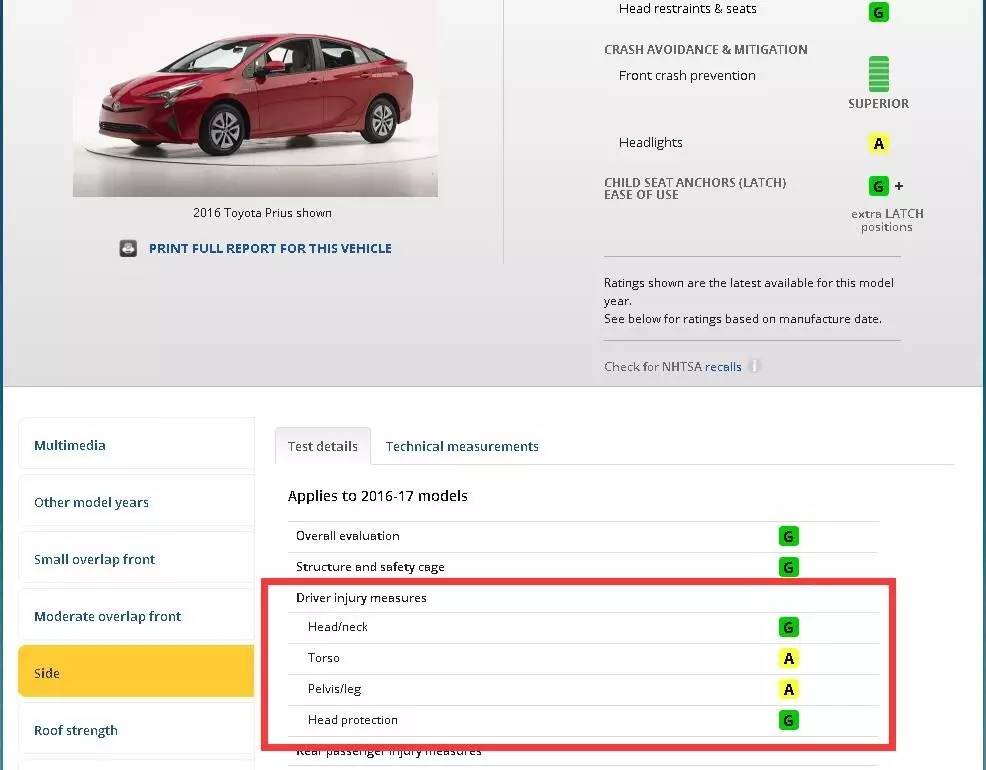 同样的侧面碰撞测试评价,两款车都是绿色无黄色