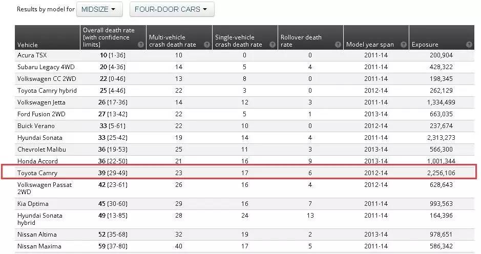 IIHS统计的死亡率,2014款丰田凯美瑞排在本田雅阁之后,多车事故死亡率和单车事故死亡率都要高于雅阁,翻车死亡率低于雅阁。