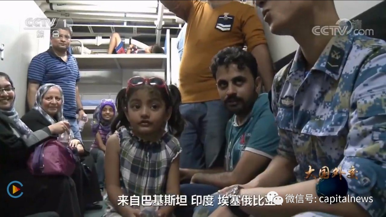 “习近平总书记果断命令,中国海军护航编队即刻前往撤侨,这是我国第一次动用军舰来执行撤侨的任务。”