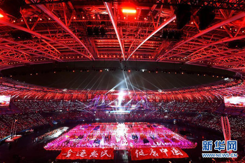 20时,奥体中心的雨还在下,中间表演区已经铺上了防滑地垫,“头顶天空”的前几排观众也穿上了组委会提前准备的雨衣。开幕式在小雨中开启。