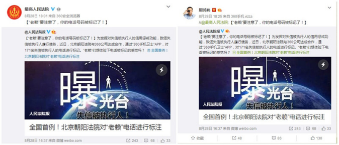 8月28日,人民法院报官方微博布了题为《“老赖”要注意了,你的号码被标记了!》的博文,明确表示“为切实发挥对失信被执行人的信用惩戒功能,敦促失信被执行人履行债务,北京朝阳法院与360公司达成合作,通过“360手机卫士”,对171名失信被执行人的进行标记。”随后,最高法院官方微博和360公司董事长周鸿祎纷纷转发了此条微博。