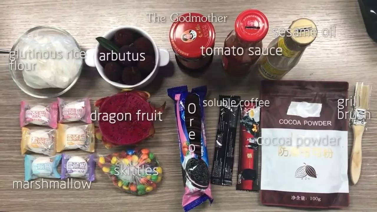 糯米粉一碗(本次妆容最重要的东西)、老干妈一瓶、棉花糖4枚、可可粉一袋、速溶咖啡一袋、芝麻油一瓶、番茄酱一瓶、彩虹糖多粒、刷子一个、火龙个半个、杨梅若干。