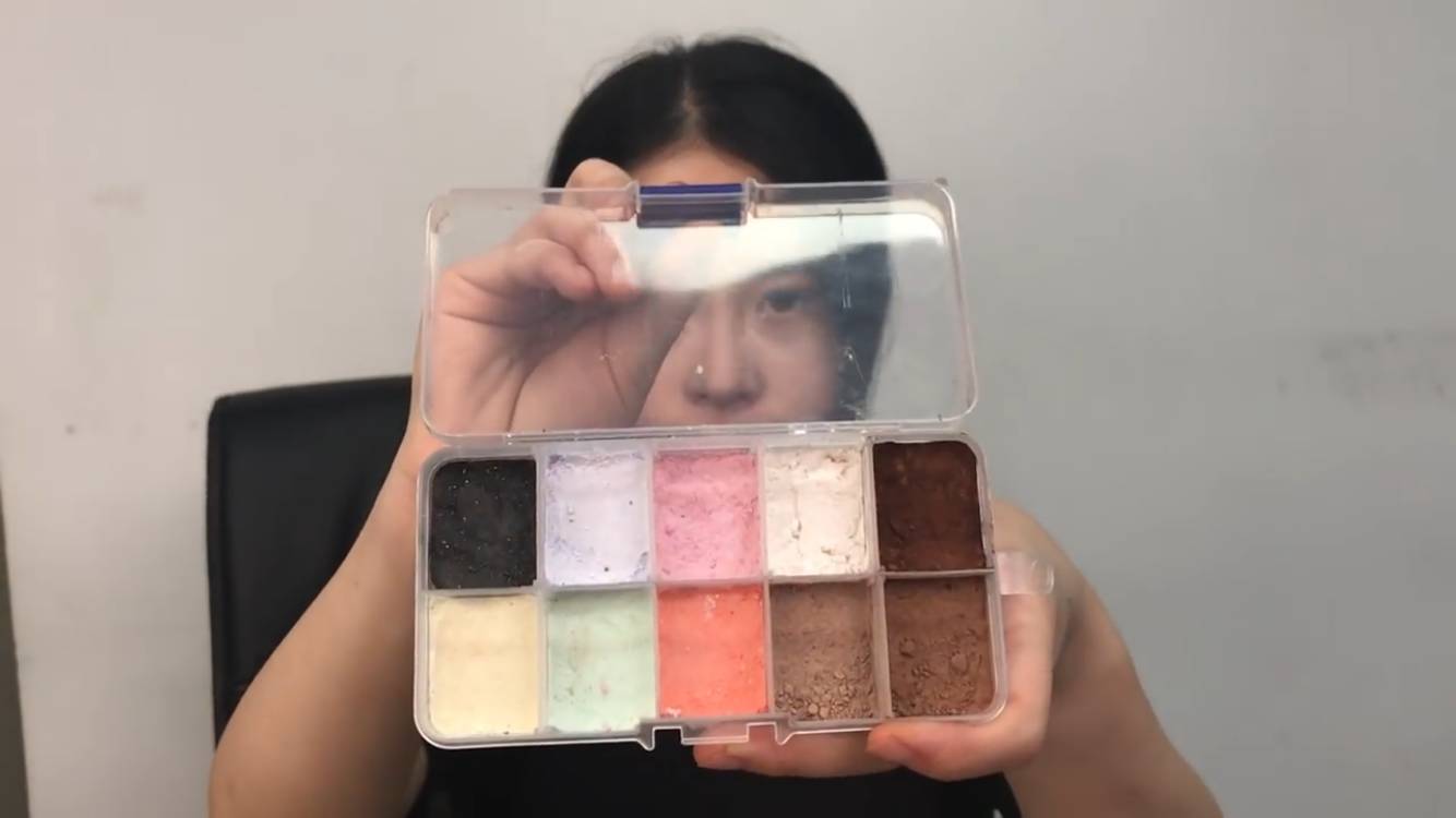 将五颜六色的彩虹糖化开、可可粉、咖啡粉按照不同比例与糯米粉混合,大地色、彩色眼影就这么合成了。本文重点糯米粉出现第3次。