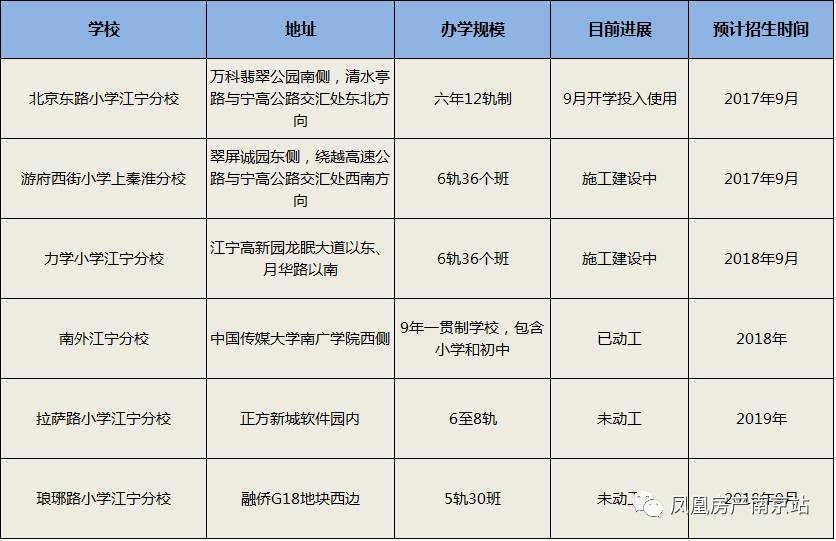 6所学校最新进展:北京东路小学江宁分校已经完工,将在今年9月开学投入使用;游府西街小学上秦淮分校、力学小学江宁分校都正在如火如荼的建设中,预计将于明年9月正式招生;南外江宁分校目前已经动工,预计将于2018年招生;拉萨路小学江宁分校和琅琊路小学江宁分校已签约入驻,预计最快今年年底动工。