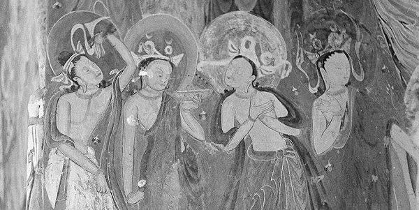 艾琳在敦煌住了下来,拍下了很多黑白照片。在她的照片里,能看到她多次将镜头对准石窟壁画中的女神。