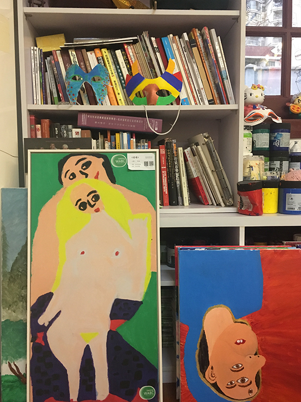 工作室内的柜子和桌子上放了许多画笔和颜料,四周摆放了众多风格迥异的画作,热传的几幅画作也陈列其中。
