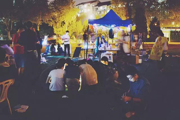 紫操上生活如此多娇,一个小点子也冒了出来:“如果能在紫操开个Bar,该多好!”2015年秋,清华大学学生会开始在每个周五晚上举办“紫操风情夜”的活动。草坪属于过于开敞、缺乏中心与方向性的空间,“紫操风情夜”支起的一顶大遮阳伞、几副桌椅,就成为了绿茵场里的聚集焦点。装饰上绚丽的小彩灯,加一块咖啡馆同款的荧光小黑板,草场的整片天地间都成为了Tsinghua Bar。越来越多的同学们拿上各自的充电台灯,带上好友和好心情,开启美好的周末模式:在桌游之夜玩起狼人杀,在西瓜之夜进行吃瓜大赛,在清明前夕做青团做盆栽,在法式风情夜看起露天电影……万千种风情,都有着青春与自由的味道。