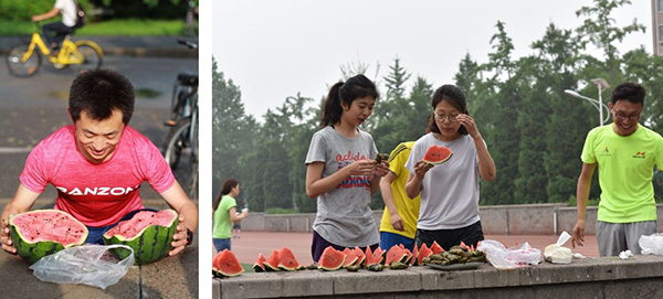 每天这个时候,长长的水泥石阶就成为了整个晨跑队的长条餐桌。桌上的“满汉全席”大多是可口的西瓜,香蕉等水果,也常常有同学们自行带来的家乡特产。大家围站在石阶旁,来一场畅快的流水席。