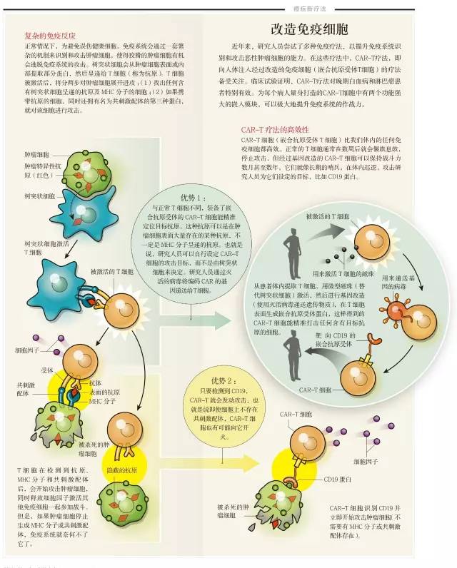 新疗法是近年来发展迅速的一种嵌合抗原受体T细胞(CAR-T)疗法,它先从患者自身采集在免疫反应中发挥重要作用的T细胞,然后重新“编程”,所得T细胞含有嵌合抗原受体,能识别并攻击癌变细胞,因此可重新注入患者体内用于治疗。