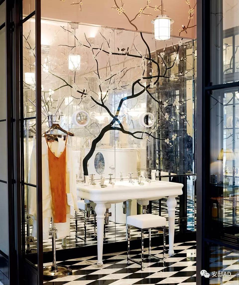 手绘梅花图案在店中浴室的镜面和墙壁上浪漫蔓延,与黑白菱格大理石形成柔软与刚硬的对照。