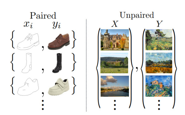 pix2pix也可以做图像变换,它和CycleGAN的区别在于,pix2pix模型必须要求成对数据(paired data),而CycleGAN利用非成对数据也能进行训练(unpaired data)。