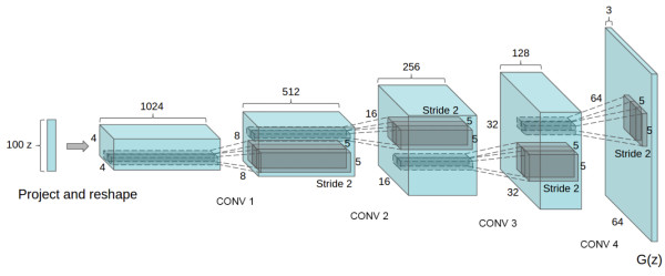 先来看下DCGAN,它的整体框架和最原始的那篇GAN是一模一样的,在这个框架下,输入是一个噪声z,输出是一张图片(如下图),因此,我们实际只能随机生成图片,没有办法控制输出图片的样子,更不用说像CycleGAN一样做图片变换了。