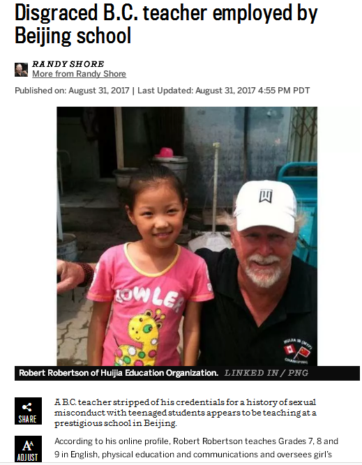 据温哥华媒体报道,一位曾经在温哥华某学校被指控性骚扰女学生的外籍男子Robert John Robertson正在北京市私立汇佳学校任教。