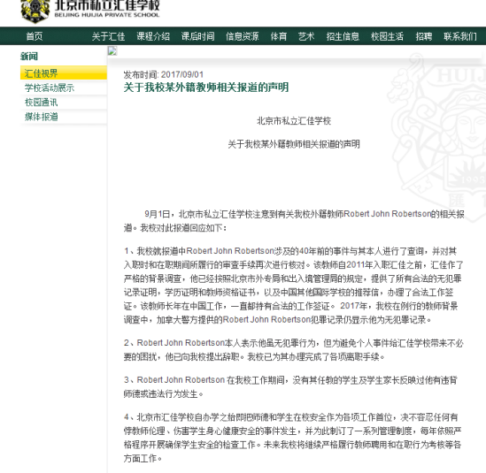 未来网(www.k618.cn)北京9月2日电(记者 于洋洋)据温哥华媒体报道,一位曾经在温哥华某学校被指控性骚扰女学生的外籍男子Robert John Robertson正在北京市私立汇佳学校任教。报道称,Robert John Robertson的简历显示,他自2011年起就在北京某国际学校任职,教授七到九年级的学生。